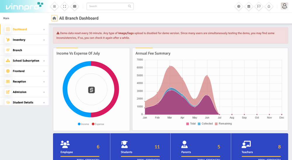 Vinnpro School Management is Multi-Branching education ERP System. This application will help the organization that has many Branch Schools and a SuperAdmin can control all the branches and staff.
